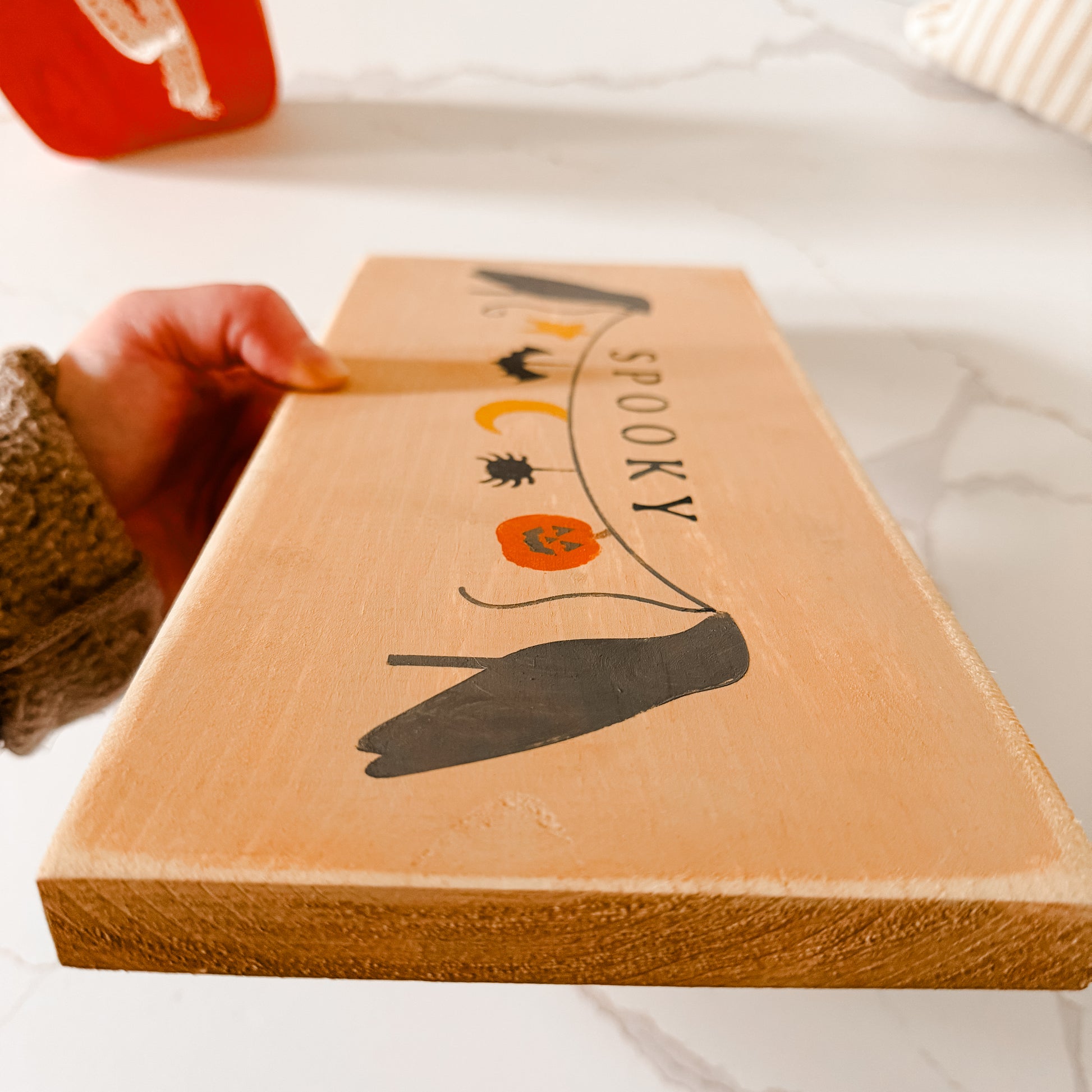 Add a touch of spooky charm to your home with this rustic Halloween wood sign! Featuring black crows holding a festive garland with a star, bat, moon, spider, and jack-o-lantern, this handcrafted sign makes the perfect accent for your fall mantel, shelf, or entryway display. Each sign is painted and finished by hand, giving it a cozy, one-of-a-kind look for your seasonal décor.