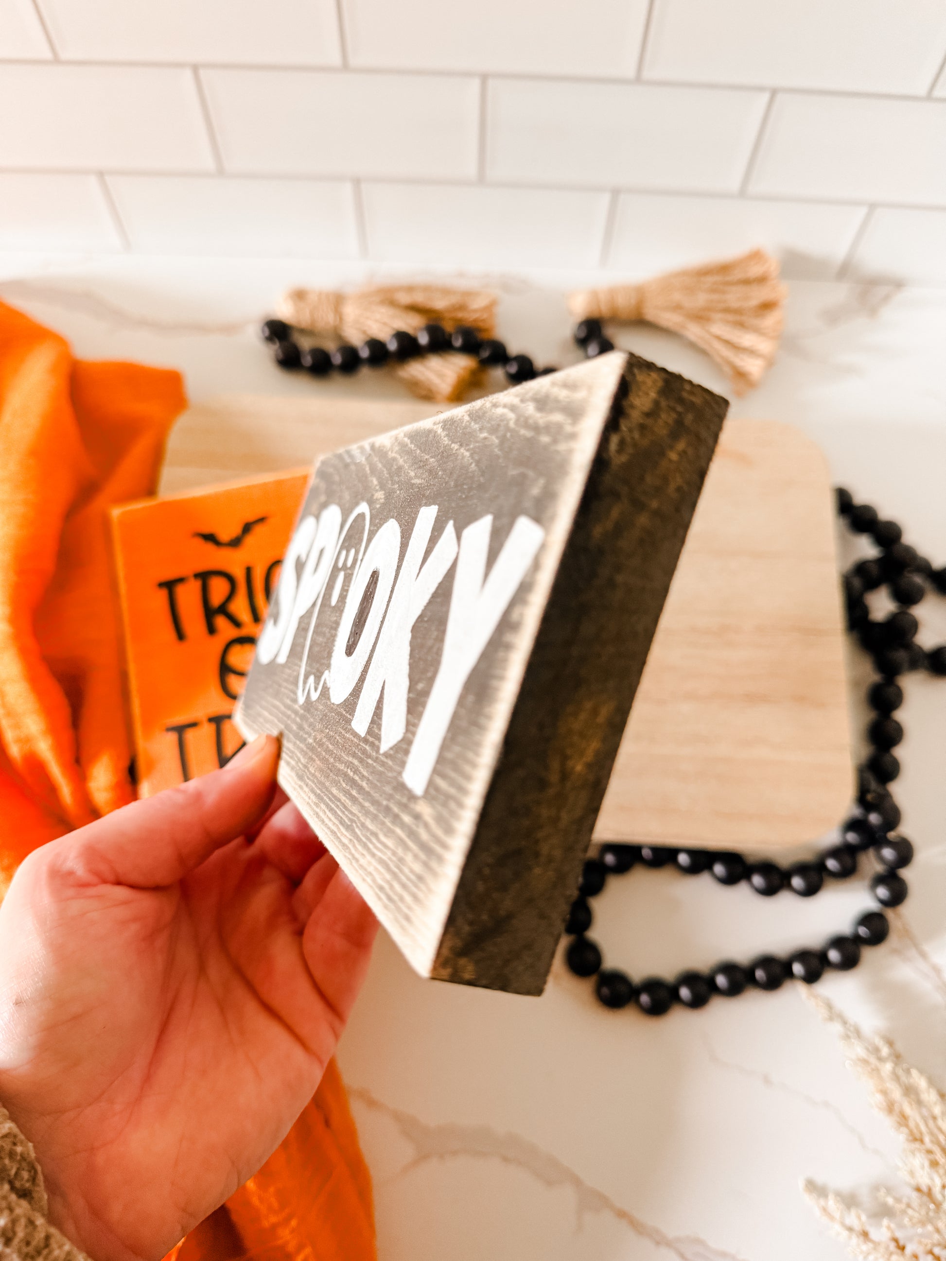 Bring a little haunted charm to your fall home with this Spooky Halloween wood sign. Featuring bold white lettering with a cute ghost for the second “O,” this rustic sign is perfect for tiered trays, shelves, mantels, or entryway tables. Hand-painted on distressed wood, it adds the right touch of farmhouse Halloween decor without being too scary.